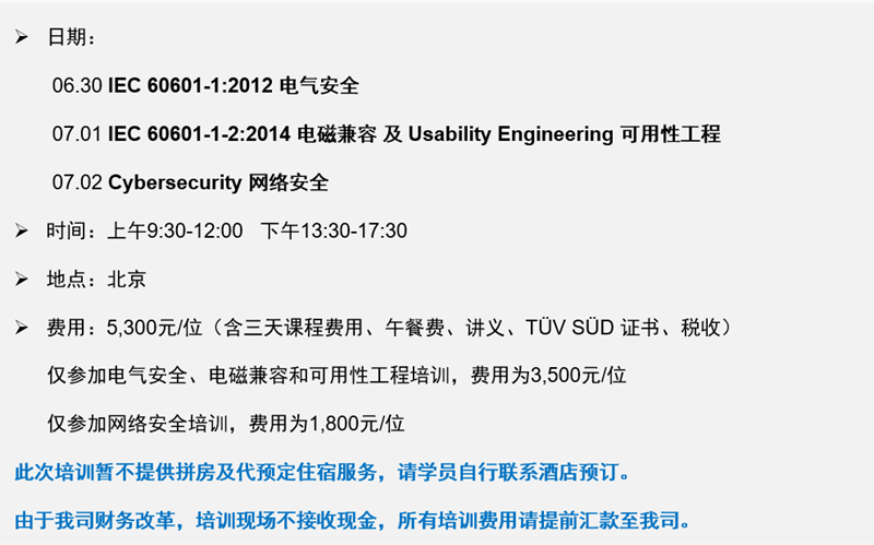 我们真诚邀请您参加2021年06月30日至07月02日由TÜV南德意志集团医疗、健康服务部门在北京举办的 IEC 60601-1:2012 电气安全测试、IEC 60601-1-2:2014 电磁兼容测试、Usability Engineering 可用性工程以及Cybersecurity网络安全专题研讨会。
