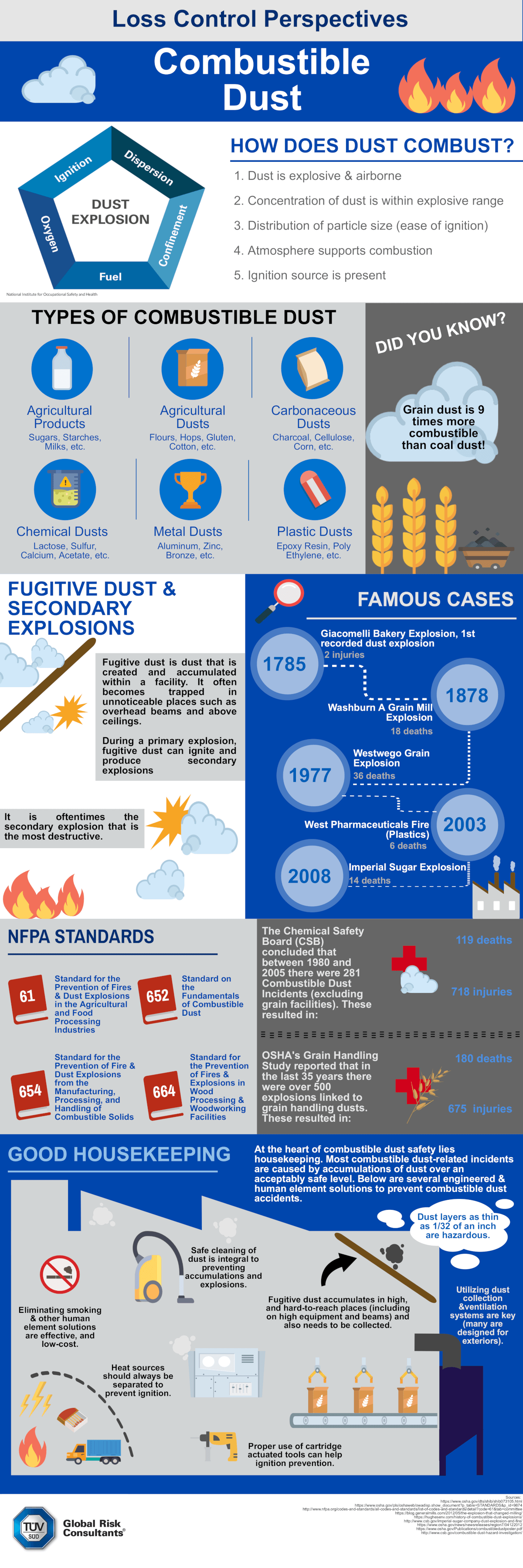 Are you aware of the hazards that combustible dusts pose to your facility? The 2017 Combustible Dust Incident reported that 169 combustible dust incidents occurred in 2017, killing 13 and injuring 163. While safety standards are in place to minimize losses, housekeeping and human element programs lie at the heart of combustible dust safety.